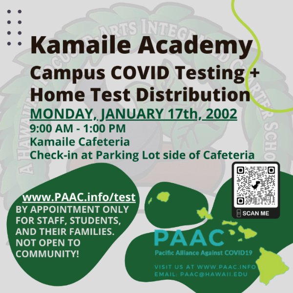 Monday, January 17th we will have COVID testing on campus for STAFF, STUDENTS, AND THEIR ʻOHANA by appointment only. This event is not open to the community, just our school. Please scan or go to www.paac.info/test to register for your appointment.