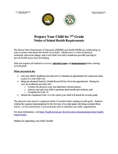The Hawaii State Departments of Education (HIDOE) and Health (DOH) are collaborating on ways to protect and ensure the health of our keiki. Adolescence is a time of physical, emotional, and social change, and a well-child visit with a healthcare provider can help to prevent health issues from developing. State law requires all students to receive a physical exam and immunizations before starting seventh grade.