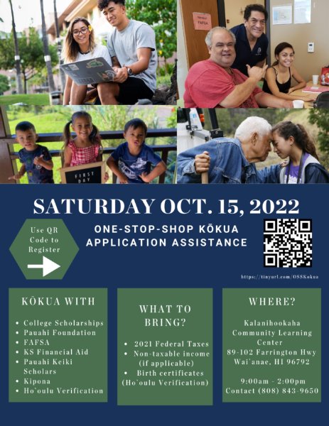 One-Stop-Shop Kōkua aka FAOSS has made itʻs return! KSRC Oʻahu will be hosting One-Stop-Shop Kōkua session on Saturday October 15, 2002 at Kalanihookaha Learning Center from 9am – 2pm. Folks will be ready to assist with Kamehameha Schools College Scholarships & FAFSA (KS requirement is to submit SAR) in addition of our Kamehameha Schools campus financial aid, Pauahi Keiki Scholars, Kipona and Ho`oulu Verification Services. See the flyer for more info!