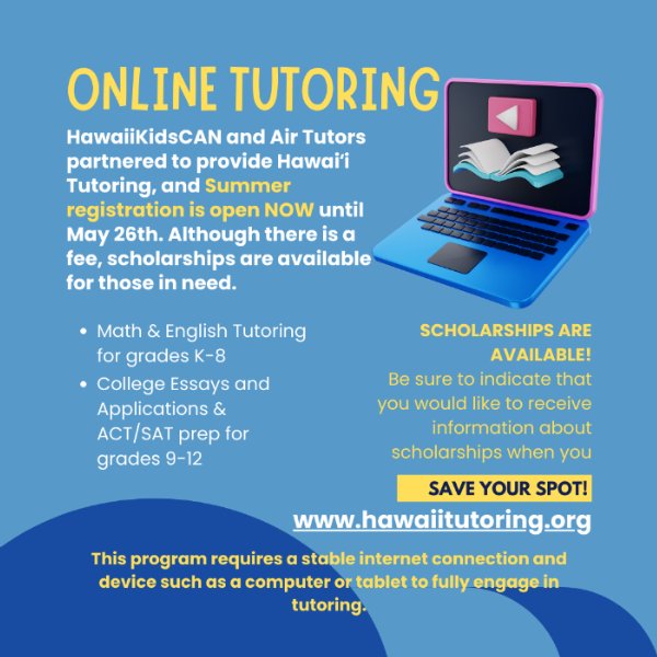 Summer Tutoring with Hawaiʻi Tutors - Registration is open now. The deadline to apply is 5/26/23.HawaiiKidsCAN and Air Tutors partnered to create Hawaiʻi Tutoring to match keiki with expert educators for a supportive tutoring experience. Grades K-8 can support Math and English, while grades 9-12 can receive ACT/SAT prep, college essays & application support. There is a fee for tutoring but SCHOLARSHIPS are available!