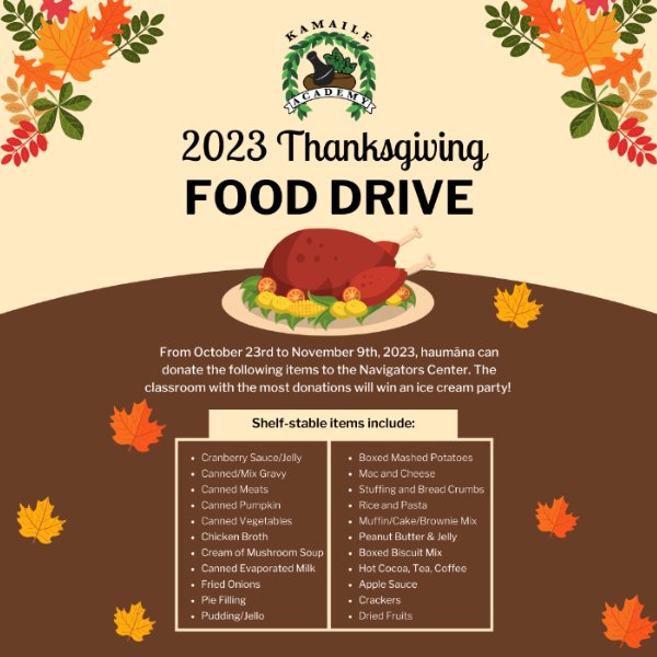 The Thanksgiving Food Drive is in full swing, and the Nav Center is ready to receive your generous donations! Students are encouraged to deliver their donations to their homeroom teachers and the Nav Center will be actively collecting them every Tuesday and Thursday, beginning tomorrow, October 26th.The classroom with the most donations will win an ice cream party! We extend our heartfelt mahalo for your generosity and for your role in boosting school spirit while giving back to those in need. Mahalo!