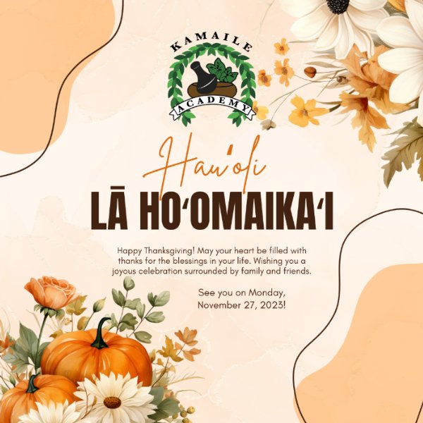 From our Kamaile Academy family to yours, may your heart be filled with thanks for the blessings in your life. Wishing you a joyous celebration surrounded by family and friends. See everyone back at school on Monday, November 27, 2023!