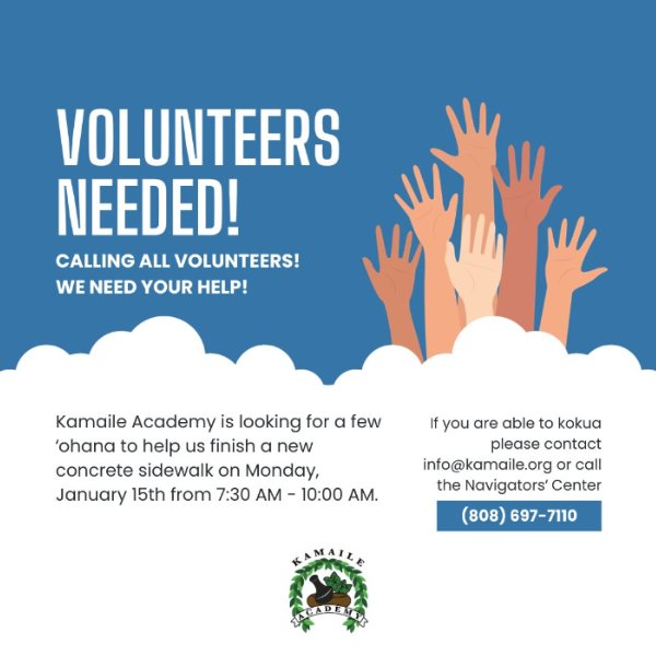 Calling all volunteers! We are looking for ʻohana to help finish a new concrete sidewalk for Monday, January 15th from 7:30 AM to 10:00 AM. Please read the flyer for more information. Mahalo!