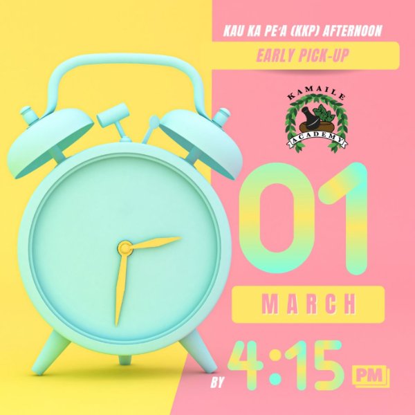 Aloha Kau Ka Peʻa Afternoon Connections ʻohana! We will be releasing students early on Friday, March 1, 2024 due to a school event. Please plan to pick-up your keiki by 4:15pm on March 1st. Mahalo!