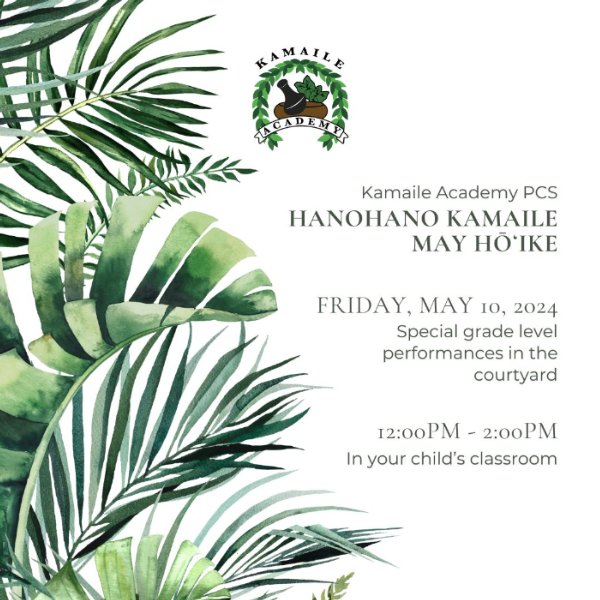 Please save the date for our Hanohano Kamaile May Hōʻike set for Friday, May 10, 2024 from 12pm-2pm. Early release forms and flyers will be distributed to Pre-K to Grade 6 haumāna soon!