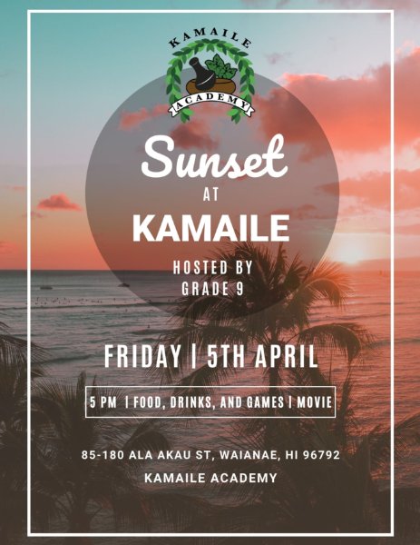Bring your loved ones and join Grade 9 at their Sunset at Kamaile event this Friday, April 5th from 5pm - 8pm. See you there!