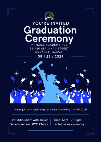 Join us as we honor the Class of 2024 at Kamaile Academy! We celebrate their achievements with a warm send off to conquer new horizons. Save the date and share the aloha! Thursday, May 23rd from 6pm - 7:30pm at Kamaile Academy.