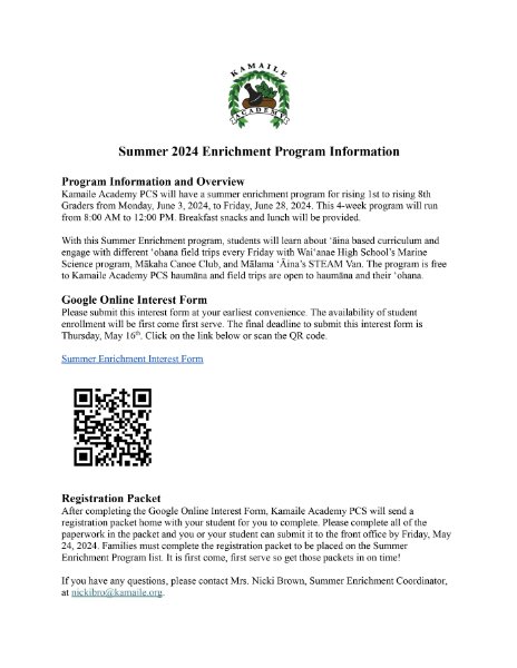 Attention Rising 1st to Rising 8th Grade ʻOhana! Are you interested in Summer School? If so, please fill out our interest form by Thursday, May 16th showing your interest. Click on the link here to access the interest form: https://forms.gle/Gwxjz7FySAW86eVU8