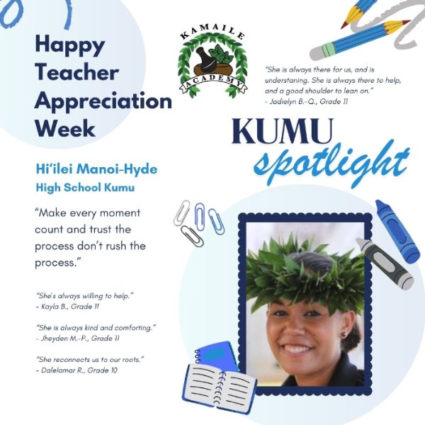 Today, let's shine a light on Kumu Hiʻilei Manoi-Hyde! Discover the invaluable piece of advice she would offer her high school self. A big mahalo to Kumu Hiʻilei for her dedication towards our haumāna!