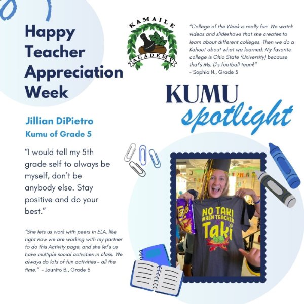 In celebration of Teacher Appreciation Week, we're highlighting Kumu Jillian DiPietro in our Kumu Spotlight! Her insightful self-advice resonates deeply. Big mahalo to Kumu DiPietro for her dedication and nurturing spirit towards our school!