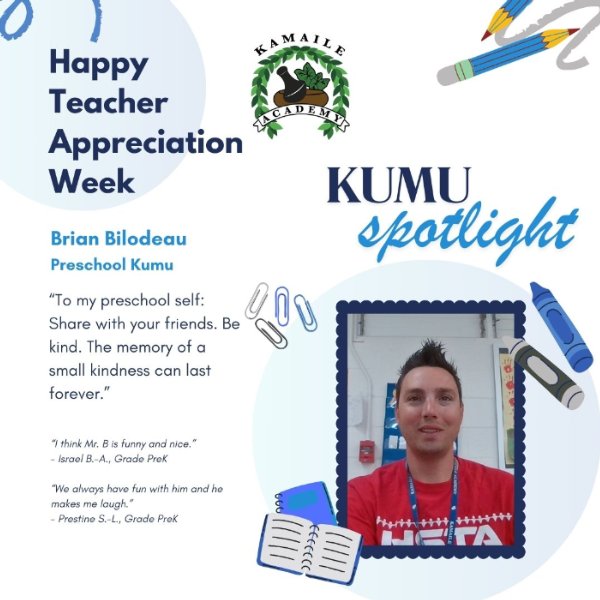 Finally, let's shine the spotlight on Kumu Brian Bilodeau! His advice to his younger self holds much wisdom. Mahalo, Kumu Bilodeau, and to all the incredible Kumu at Kamaile Academy. Your dedication and passion enrich our school community. Happy Teacher Appreciation Week!