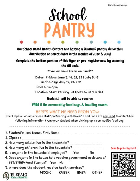 Summer Keiki Pantry begins today at Kamaile Academy! Pickups are from 12pm-1pm at our staff parking lot. Check the flyer for all the dates this summer and register at this link if you would like to receive food bags: https://docs.google.com/forms/d/e/1FAIpQLScU_RihW3J4Y2JfrwCd24ppp9vm_koZ3EN8J3wCDvEr3TOSHA/viewform