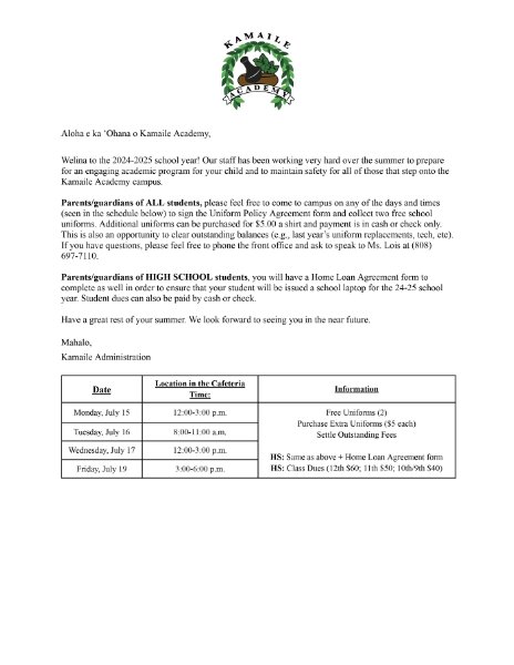 Aloha kākou, hope everyone's having a great summer! LET’S GET READY for school year 24-25!! See the flyer and letter for uniform pickup days and plan accordingly! See you there!
