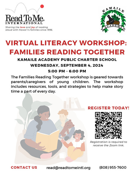 Read To Me International is hosting a “Families Reading Together” workshop just for Kamaile Academy haumāna and their ʻohana on Wednesday, September 4th virtually on Zoom from 5-6pm. The workshop includes resources, tools, and strategies to help make storytime a part of every day. Attendees who register, participate, and complete the survey will receive a free book! ʻOhana can register here:https://us02web.zoom.us/meeting/register/tZwv...