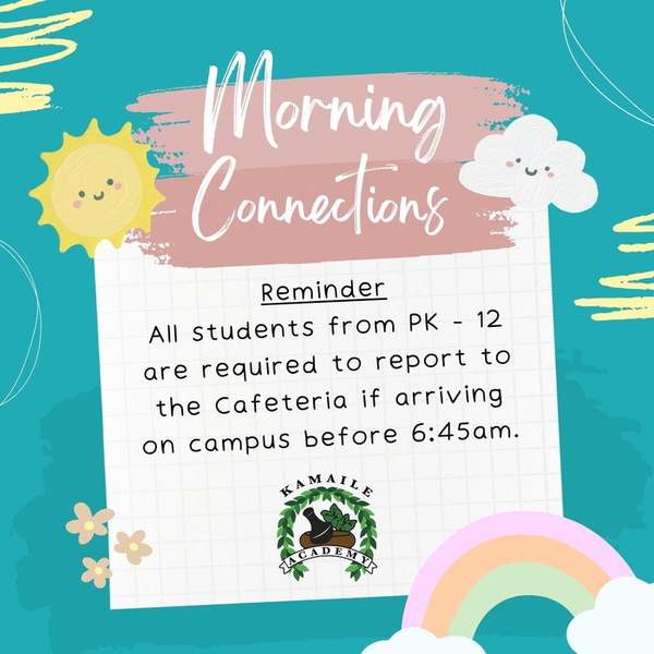 Happy Monday! Just a reminder that all students on campus before 6:45am MUST report to the Cafeteria for Morning Connections. Breakfast begins at 6:45am!