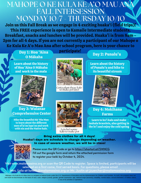 Aloha Kamaile Intermediate haumāna! During Fall Break, 7th and 8th graders are invited to join Mahope's Fall Intersession program. There are fun field trips planned so you don't want to miss it! Check out the flyer for more details. Register by October 4th.Registration Link: