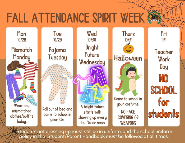 Fall Attendance Spirit Week starts on Monday, October 28th with Mismatch Monday! Wear any mismatched clothes/outfits this day. View the flyer for all of the themes this coming week. Have a great weekend!