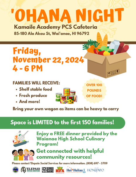 Join us for ʻOhana Night on November 22nd from 4-6pm, hosted by ʻElepaio Social Services and Kamaile Academy! Space is limited to the first 150 families so arrive early! Enjoy a free dinner provided by the Waianae High School Culinary Program and get connected with helpful community resources. Check out the flyer for more details!