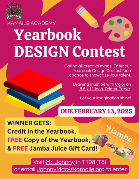 Calling all haumāna! We are looking for a Yearbook Design for our Secondary Yearbook. Please see the flyer for more details on how to enter your design and the prizes you could win! Please submit it to Mr. Johnny in T8 by February 13th.