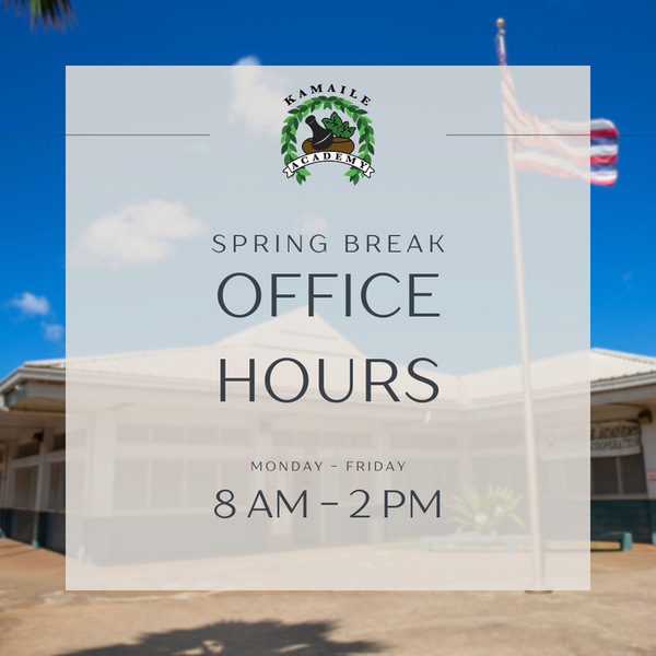 Our Spring Break office hours will be from 8am - 2pm. Normal office hours will resume Monday, March 24th. Mahalo!