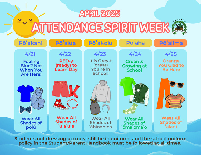 Plan out your outfits and prepare for our next Attendance Spirit Week starting on April 21st!