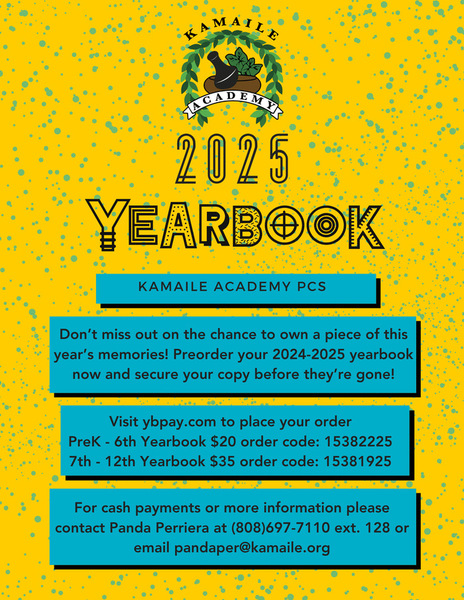 Today is the last day to put in your Yearbook Preorder! You can pay online at ybpay.com and enter the code on the flyer, or you can pay in-person with Ms. Panda at the Navigators Center by 2pm! Mahalo and have a great Monday!