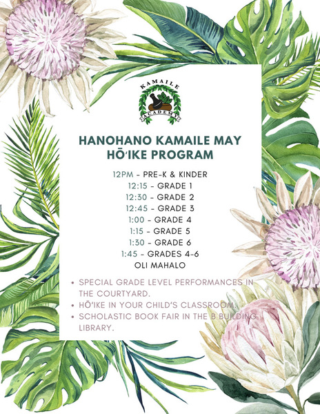 We look forward to seeing our Elementary ʻohana tomorrow from 12pm - 2pm for Hanohano Kamaile May Hōʻike! Aloha wear is optional. Haumāna not wearing aloha wear must be in school uniform. Hōʻike will take place in your childʻs classroom. Special grade level performances will be held in the Courtyard. ʻOhana are also welcomed to check out our Scholastic Book Fair in B-Building. We will see you then. Mahalo!Save the Date for our Hanohano Kamaile May Hōʻike set for Friday, May 9th from 12noon - 2pm. Aloha wear is optional for students on this day. If students choose not to wear aloha wear, please send them to school in their regular uniform. See the flyer for more information!