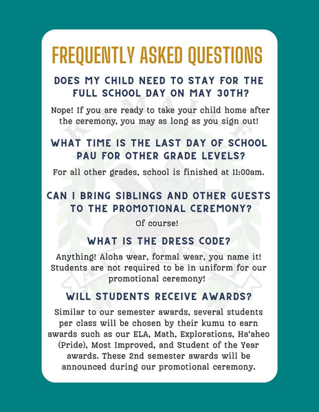 Attention Kindergarten ʻOhana! The Kindergarten Promotion Ceremony is on Friday, May 30th from 9am-10am in the Library Courtyard. Please see the flyer for more information.
