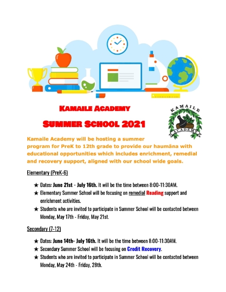 Summer School is invitation only. Students who are invited will be contacted next week. Kamaile Academy will be hosting a summer program for PreK to 12th grade to provide our haumāna with educational opportunities which include enrichment, remedial, and recovery support, aligned with our school-wide goals.
