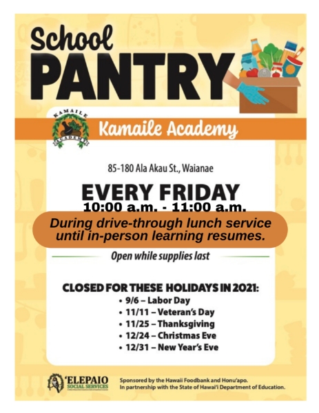 School Pantry will be drive-thru during lunch service until in-person learning resumes.