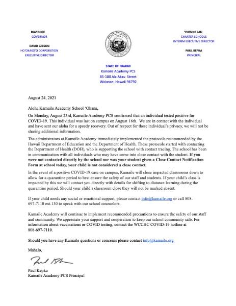 Principal Letter Dated 8/24/21 - Positive COVID result