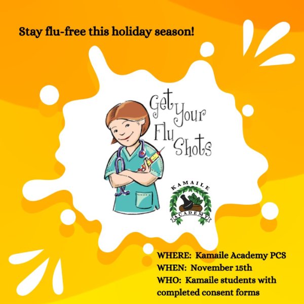 The Flu Shot Clinic is coming to Kamaile Academy PCS on November 15th! Your child will come home with a consent form. If you want your child to be vaccinated, please complete the form and return to your homeroom/advisory teacher as soon as possible. Mahalo!