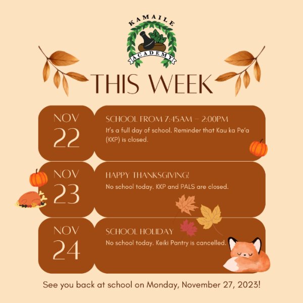 November 22 - School from 7:45AM - 2:00PM- It's a full day of school. Reminder that Kau ka Peʻa (KKP) is closed.