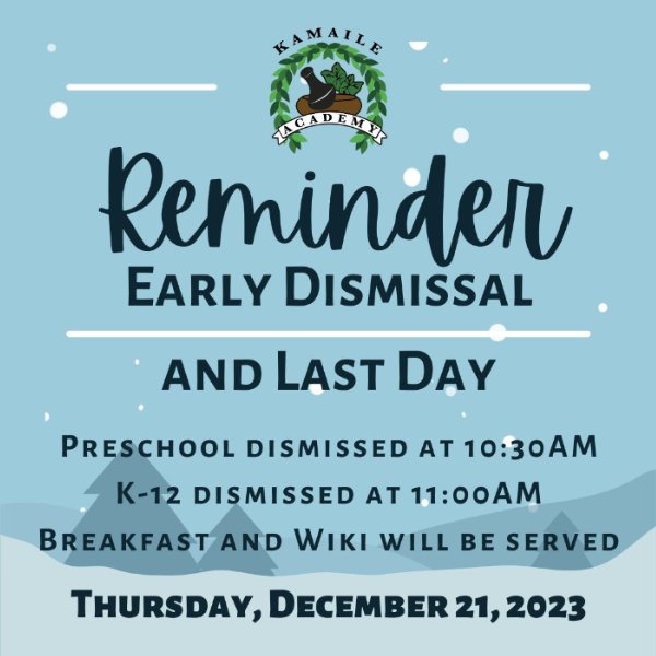 Aloha families! Just a friendly reminder that this coming Thursday, December 21st we have early school dismissal. It also is the last day of school before Winter Break. Preschool will be dismissed at 10:30am, and K-12 will be dismissed at 11:00am. Breakfast and Wiki Breakfast will be served as normal. Mahalo and have a great weekend! See you Monday.