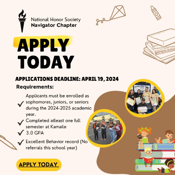 I hope everyone is enjoying their Spring Break! The enrollment for National Honor Society School Year 2024-2025 is officially open for incoming sophomores, juniors, and seniors! Contact Kumu Kama via email at chancruz@kamaile.org on how to apply.