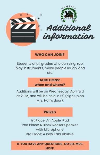 We have a Talent Show coming up on Friday, April 12th from 5-7pm, hosted by Mrs. Ceri Hoff! Auditions are being held on Wednesday, April 3rd at 2pm in P9. Please encourage haumāna of all grades to sign up and participate. There are some really great prizes that include an Apple iPad, a Block Rocker Speaker + microphone, and a new Kala Ukulele. See the flyer for more information.