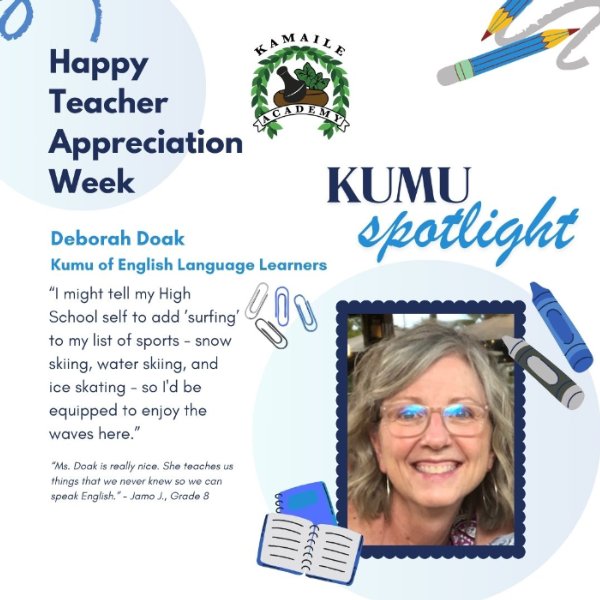Continuing with our Kumu Spotlight for Teacher Appreciation Week, we featured Kumu Deborah Doak and asked her, if she could give her high school self advice, what would it be? Mahalo Kumu Doak for your dedication to our haumāna!