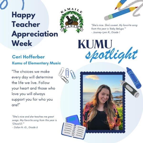 Continuing our Kumu Spotlight, we feature Kumu Ceri Hofferber! Her wisdom shared with her younger self shines brightly, just as her impact on the students who attend her music class. Mahalo nui, Kumu Hoff, for your unwavering kindness and commitment to our school.