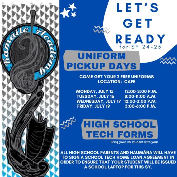 Aloha kākou, hope everyone's having a great summer! LET’S GET READY for school year 24-25!! See the flyer and letter for uniform pickup days and plan accordingly! See you there!