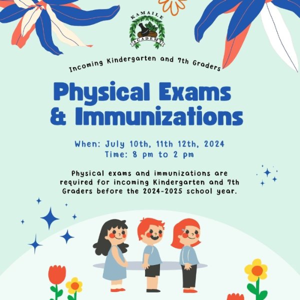 Waiʻanae Coast Comprehensive Health Center is on campus today, July 11, and tomorrow, July 12, for physical exams and immunizations. If you are interested in an appointment, call (808) 542-2521.