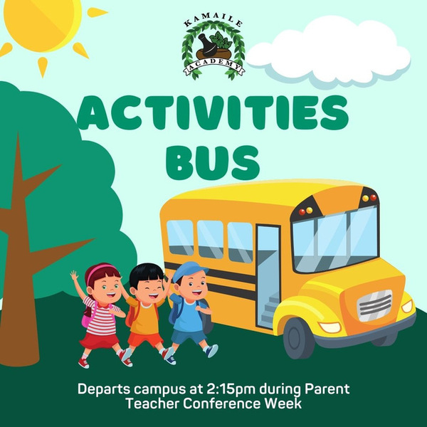 The Activities Bus will depart campus at 2:15pm during Parent Teacher Conference Week. Please have haumāna report to the Cafeteria at the 1pm dismissal to sign in with Aunty Panda. Mahalo!