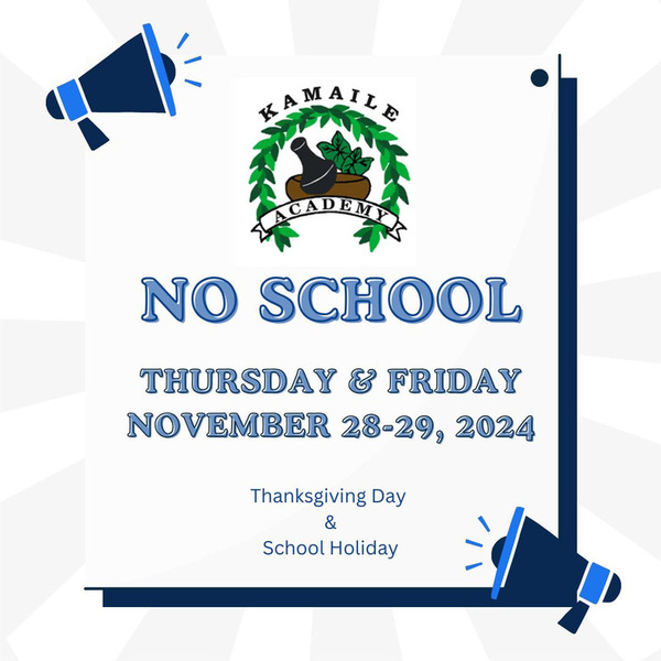 There is no school tomorrow and Friday (November 28 & 29). We will see haumāna back on campus on Monday, December 2nd! Have a safe and Happy Holiday weekend!