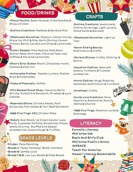 Winter Literacy Fest is this Thursday, December 12th at 5pm! If your child is in Pre-K to Grade 6 and in high school hula, they will be performing during the student showcase. Come and enjoy the free literacy resources, student performances, and food/craft vendors. Bring your own chairs/mats to sit on. You don't want to miss it! See you there!