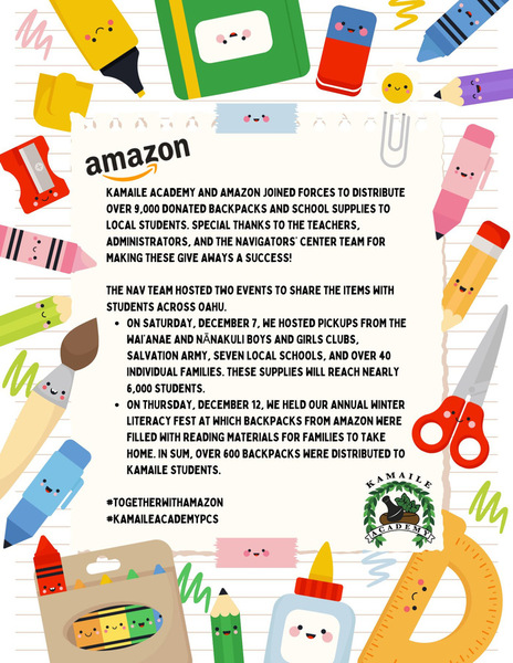 A HUGE Mahalo nui loa to our generous donors at Amazon for donating two shipping containers full of school supplies for Kamaile Academy and the schools along the Waiʻanae Coast.
