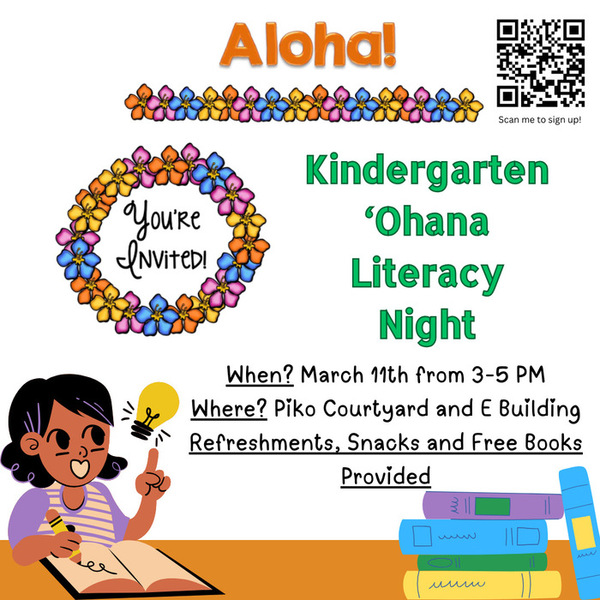 Aloha Kindergarten ʻOhana! Please join us for our Kindergarten ʻOhana Literacy Night on March 11th! See the flyer for more details.